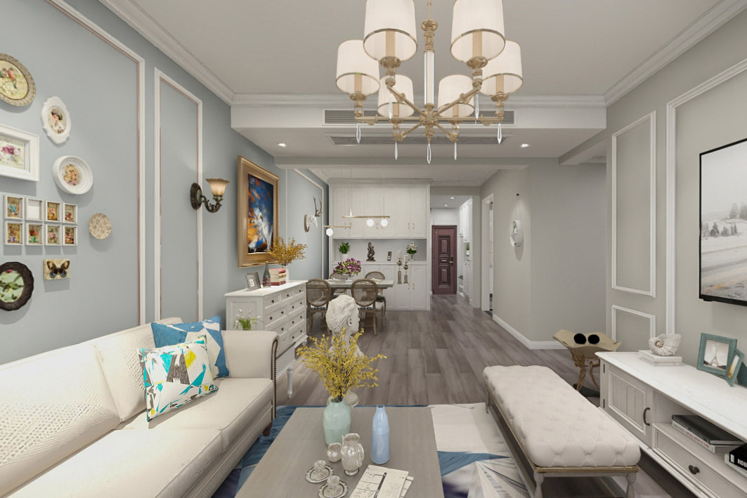 本案為3房2廳2衛,總面積106㎡。設計師以現代時尚感搭配美式風格,用優秀的設計和合理科學的布局打動了客戶。現代美式糅合了歐式的復古優雅與北歐的簡潔清新,獨有一種浪漫情調,給業主自由休閑的居住環境。
