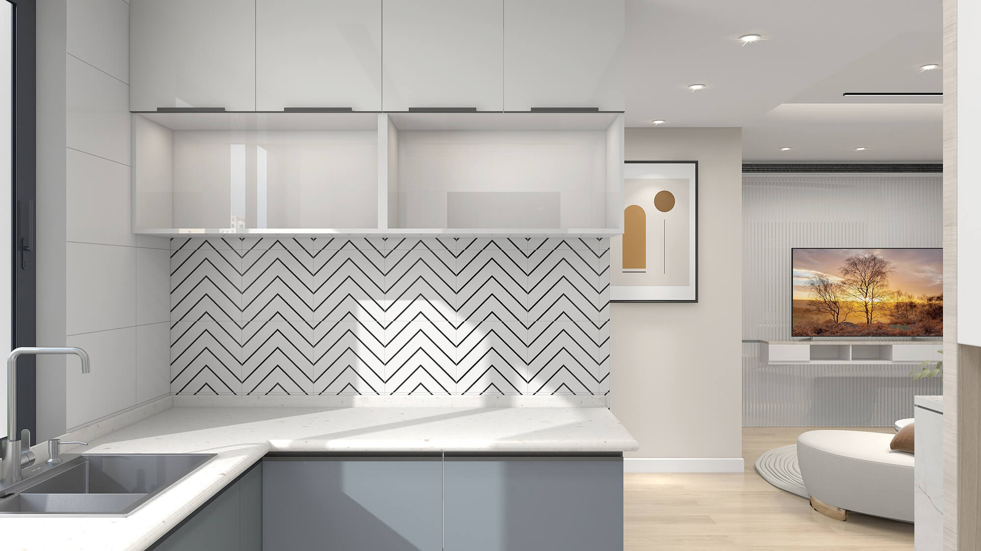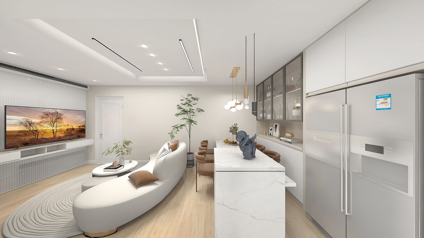 本案例為136㎡的現代簡約風格案例,大面積白色范圍的采用,使得空氣溫馨又大氣。簡潔的軟裝在流動的光影的輝映下,原本略顯清冷的空間,散發出隱奢的氣質和高級感。
