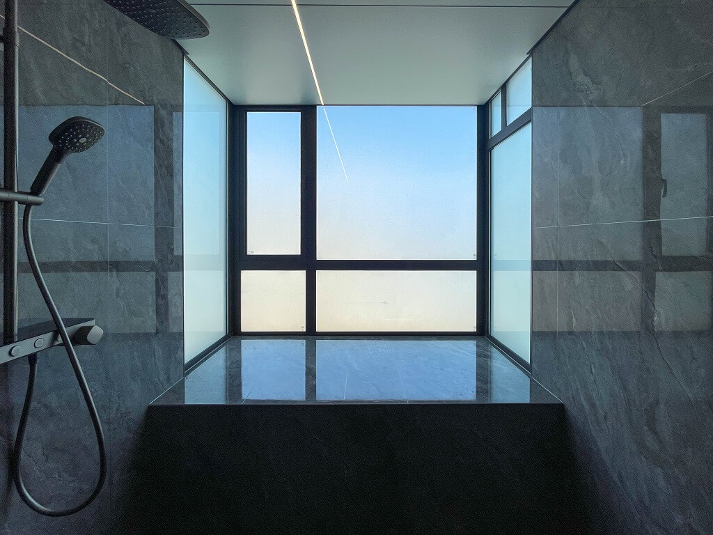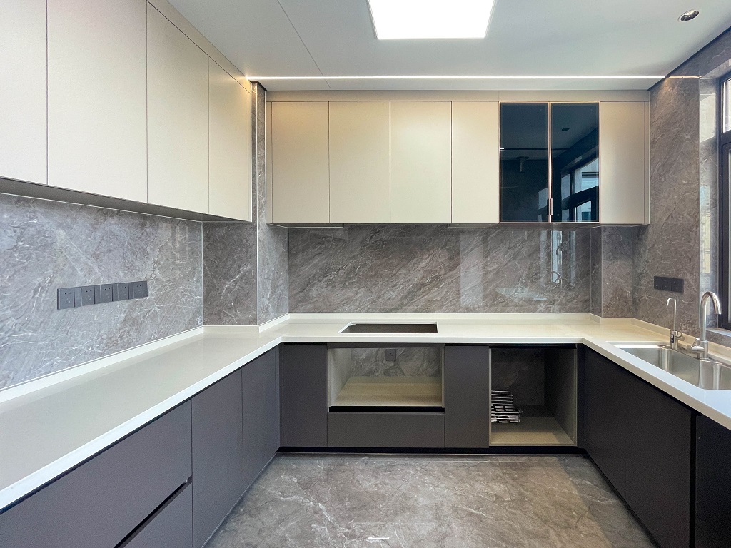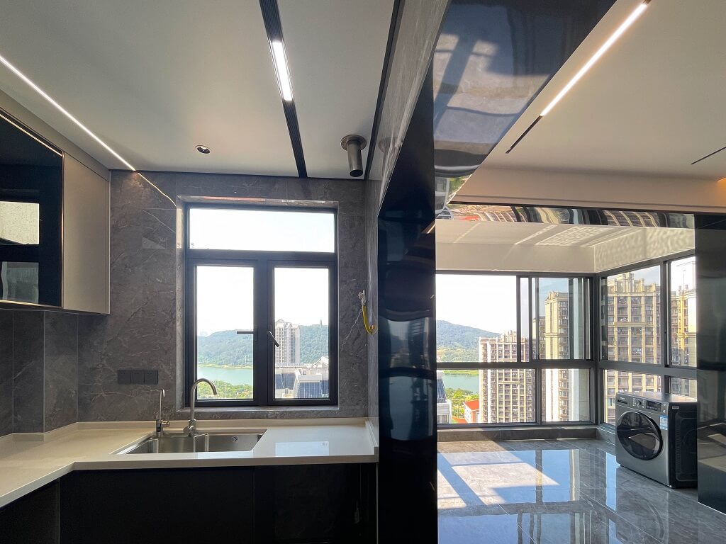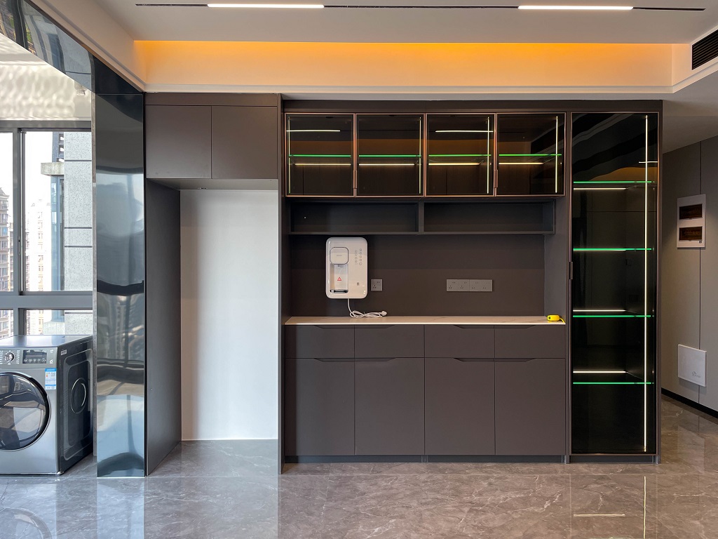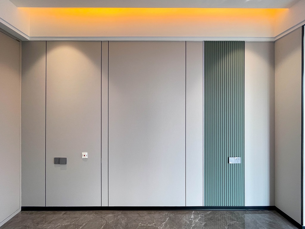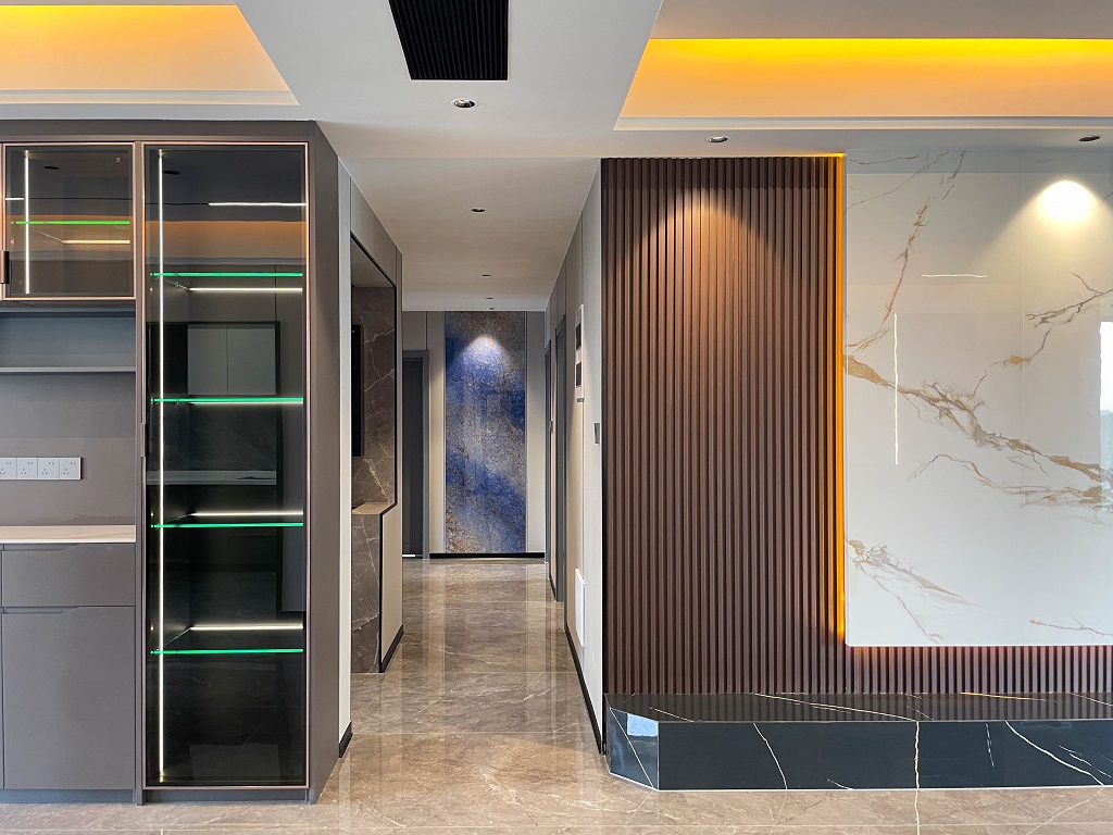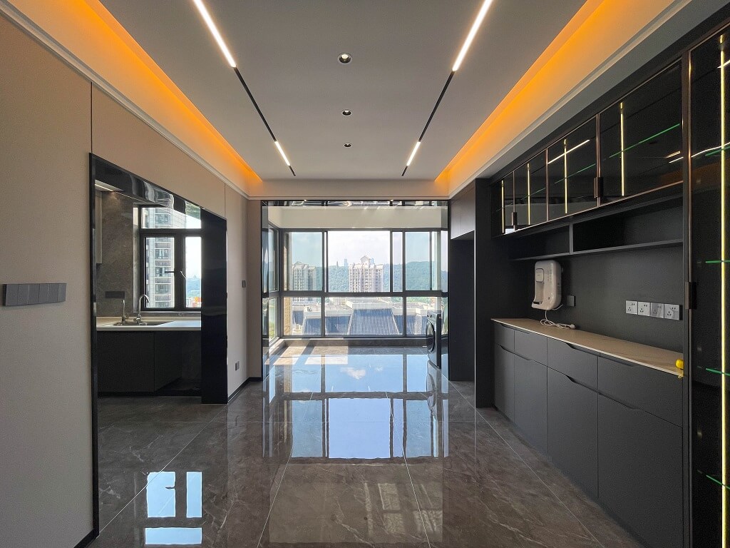整屋采用黑色亮面護墻板,與全屋通鋪的灰色瓷磚形成和諧統一的整體風格,無主燈的設計,通過局部照明和燈帶的巧妙運用,營造出柔和的光線氛圍。雙眼皮吊頂和兩邊吊頂疊加的設計,為空間增添一份獨特的層次感。