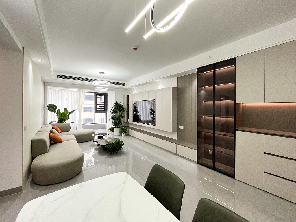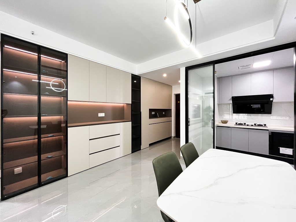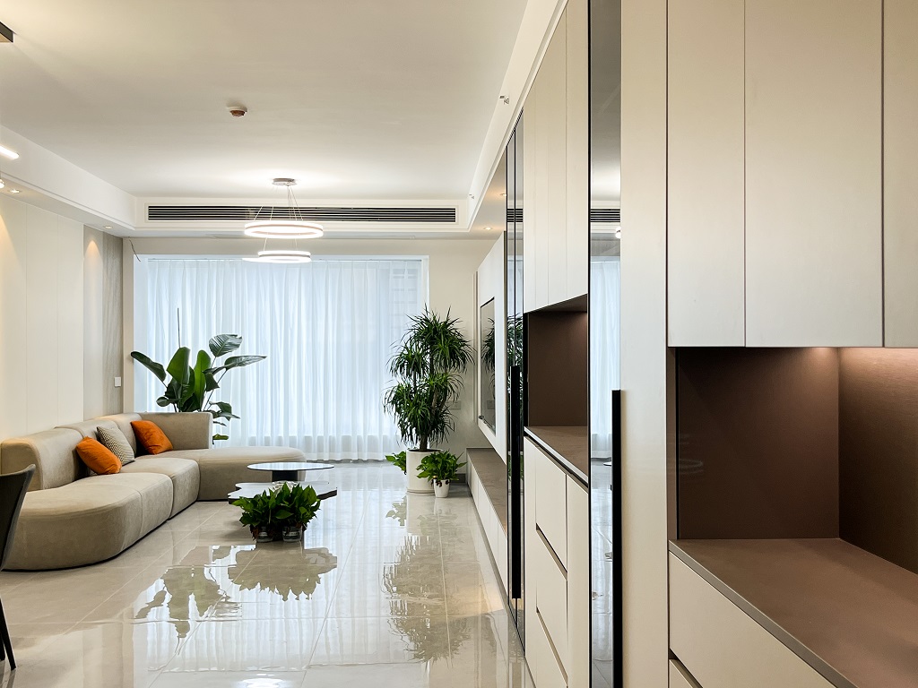 原始戶型的結構非常的方正,通過拆除客廳與陽臺之間的墻體,讓客廳的空間變得更加的開闊通透。在玄關、客廳臥室等地方增加柜體,增大了儲物空間。